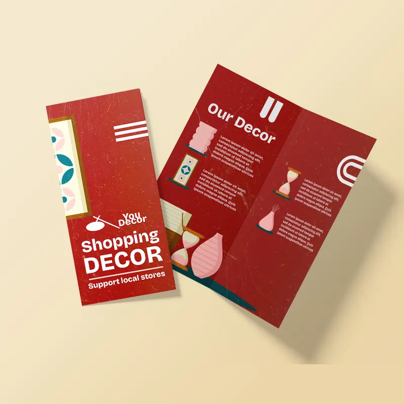 Vibrant red DL bi-fold brochure for "Shopping Decor" featuring white text, abstract geometric shapes, and home decor icons.